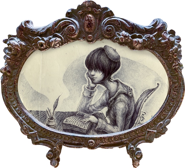 Title: "A girl lost in thought" Material: Ballpoint pen on paper Size Frame size: 170*160mm Artwork size: 150*100mm Work concept : A young girl lost in thought in her study. Is the book she has open on astronomy? Or alchemy? * 書斎で物思いに耽る少女。広げた書物は天文学?あるいは錬金術? ・タイトル「書斎の娘」 ・素材 紙にボールペン ・サイズ 額のサイズ:170*160mm 絵のサイズ:150*100mm