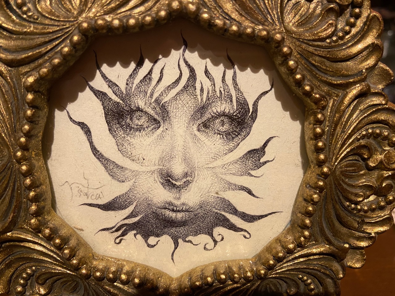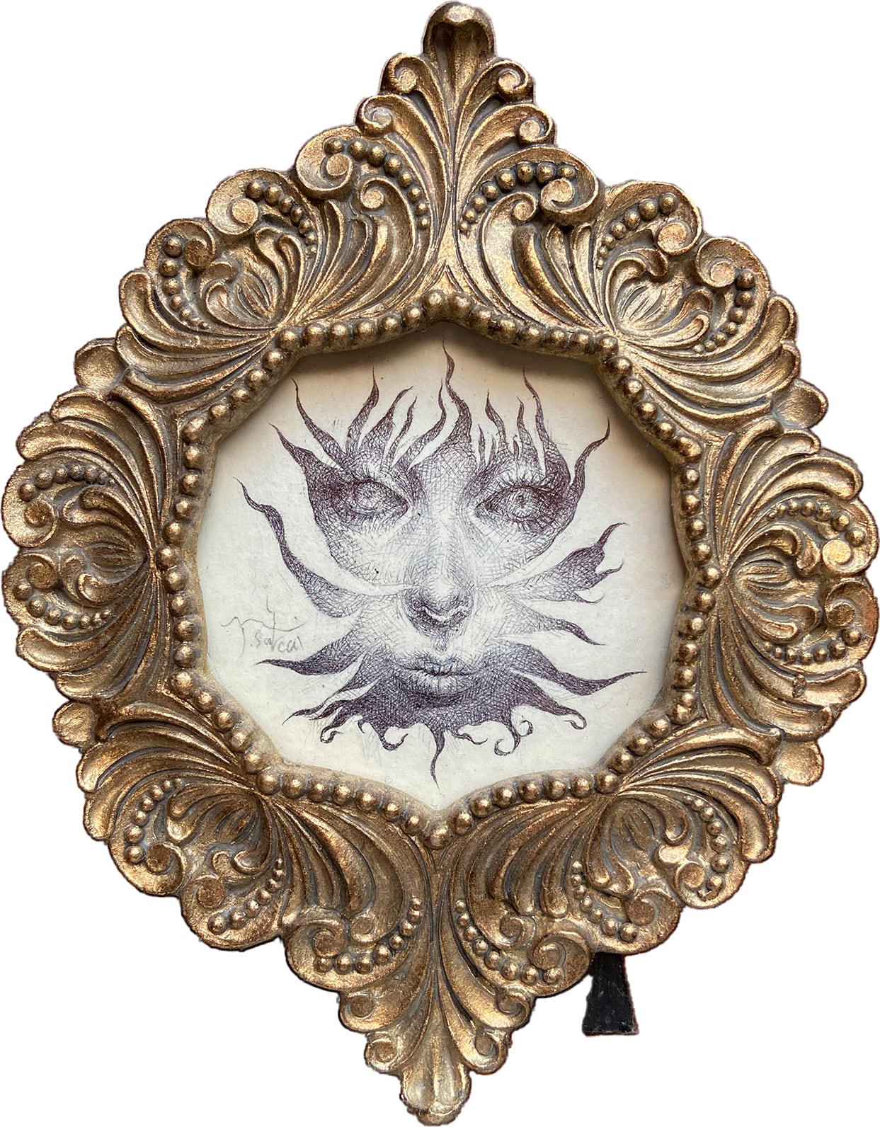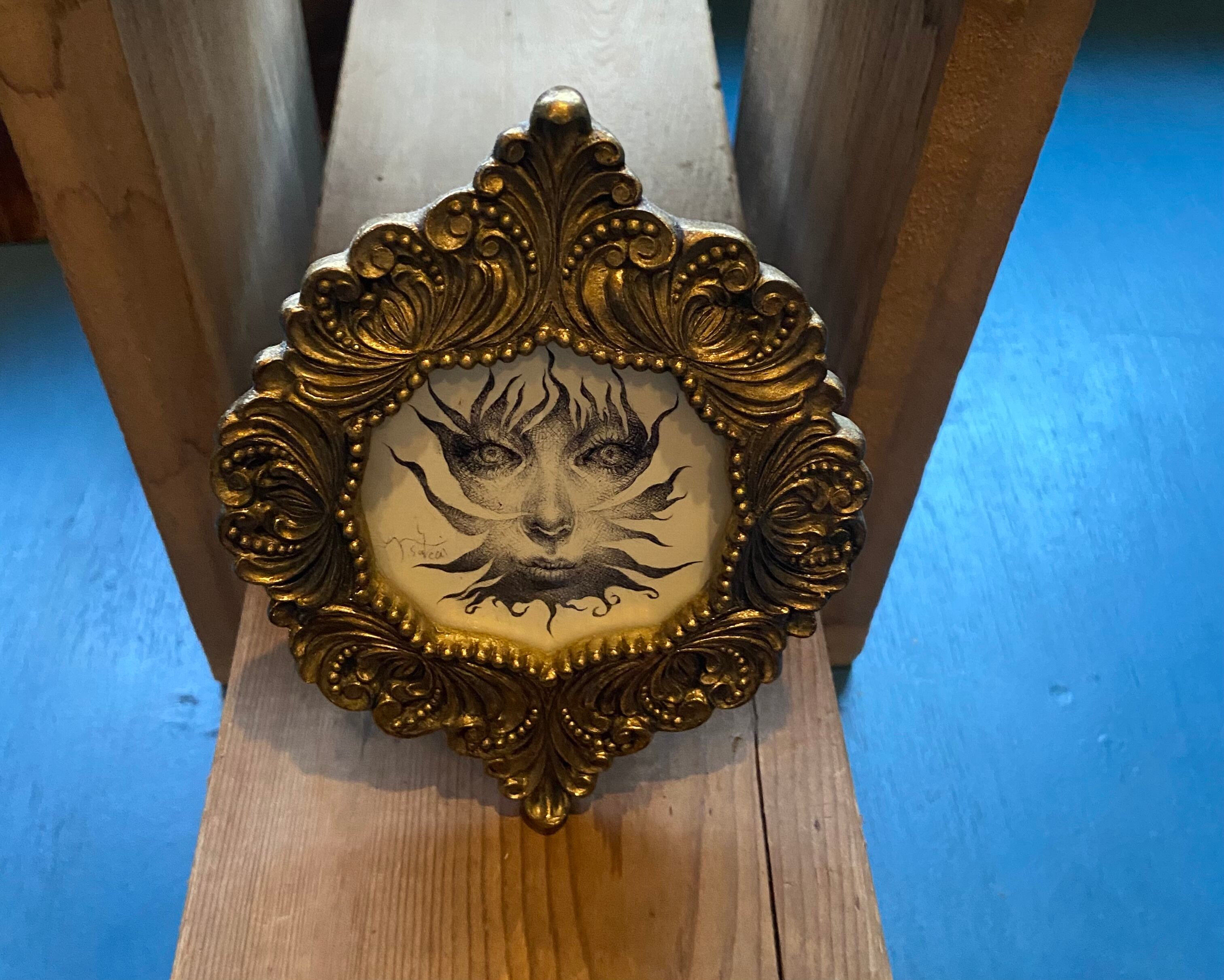 Work concept : This portrait evokes the prominence of the sun. It was inspired by the decorations on the frame.